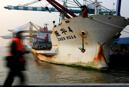 Cargo ship Zhenhua 4 docks at a Shanghai port Thursday, January 22, 2009. The 30 sailors on board fought off pirates in the Gulf of Aden last December. [Xinhua]