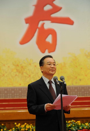 Chinese Premier Wen Jiabao speaks at a grand gathering held at the Great Hall of the People to celebrate the upcoming Spring Festival, or the Lunar New Year, and extends festival greetings to the Chinese people in Beijing, capital of China, Jan. 24, 2009. [Xinhua]