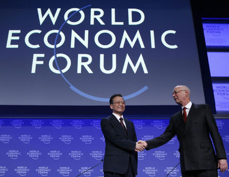Chinese Premier Wen Jiabao (L) shakes hands with Klaus Schwab, Founder and Executive Chairman of the World Economic Forum (WEF) at a special plenary session during the World Economic Forum in Davos January 28, 2009. More than 40 heads of state and government, almost double the number last year, will be joined at the WEF meeting by 36 finance ministers and central bankers, including the central bank chiefs of all the G8 group of rich countries except the United States. [Agencies]