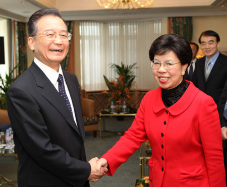 Chinese Premier Wen Jiabao shakes hands with the World Health Organization Director-General Margaret Chan before a special plenary session during the World Economic Forum in Davos January 28, 2009. [Xinhua]