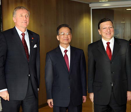 Chinese Premier Wen Jiabao (C) poses with European Commission President Jose Manuel Barroso (R) and Prime Minister of the Czech Republic Mirek Topolanek, whose country currently holds the rotating European Union presidency, following his talks with Barroso at EU headquarters in Brussels, Belgium, Jan. 30, 2009. [Xinhua]