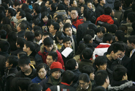 Job-seekers crowd at a job fair in Beijing February 5, 2009. College students and migrant workers flooded job fairs across the country, eager to secure work in a tight market, Xinhua News Agency reported. [Agencies]