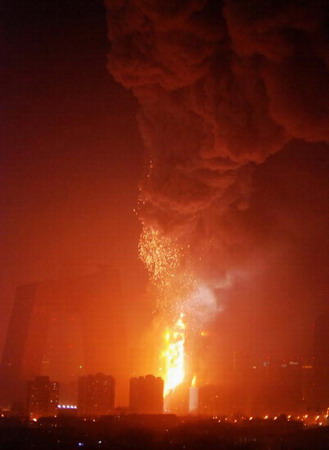 The north wing building of the new CCTV tower is on fire, which is still spreading, in downtown Beijing Monday February 9, 2009. Police have conducted traffic control around the scene. [dayoo.com]