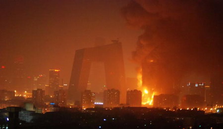 The north wing building of the new CCTV tower is on fire, which is still spreading, in downtown Beijing Monday February 9, 2009. Police have conducted traffic control around the scene.