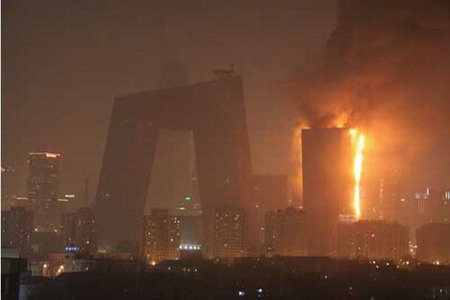 The north wing building of the new CCTV tower is on fire, which is still spreading, in downtown Beijing Monday February 9, 2009. Police have conducted traffic control around the scene. [Xinhua]