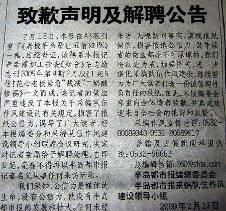 The reporter with Peninsula Metropolitan News (PMN) in Shandong published his story Sunday, saying a businessman surnamed Fan supporting five mistresses in the coastal city of Qingdao decided to keep only one as his company ran into tough times. He held a contest to decide which one should stay. One of the mistresses who lost in the contest drove the businessman and the four other women off a mountain road for revenge. The driver died while the other five were injured, the story said. It was found the story was copied from a magazine based in Wuhan, capital of central China's Hubei Province, according to the statement of the PMN. The story just changed the names of the people, according to Zhang Xin, editor-in-chief of PMN, "We are checking whether the story is true," Zhang said. Traffic police in Qinghdao said they never handled the accident and the sites mentioned in the story do not exist in Qingdao. Police said they are checking the facts with the magazine called Zhiyin, or Soul mate. The PMN apologized to the public for the incident. "Any act of ignoring fact, impairing the newspaper's credibility and misleading readers cannot be forgiven," the statement said. |