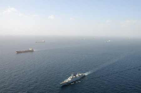 A Chinese missile destroyer Wuhan (below) escorts merchant vessels in the Gulf of Aden off Somalia, February 17, 2009. The Chinese naval fleet completed its twenty-first mission, the largest operation of its kind so far, by escorting 10 Chinese merchant ships and three foreign ones, including "Hermione" from Germany, "Viking Crux" from Singapore and "Princess Nataly" from Cyprus. [Xinhua]