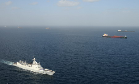 A Chinese missile destroyer Haikou (front) escorts merchant vessels in the Gulf of Aden off Somalia, February 17, 2009. [Xinhua]
