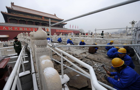 Repair work on the Jinshui Bridge at the entrance of the Forbidden City starts in Beijing, February 18, 2009. [Xinhua]