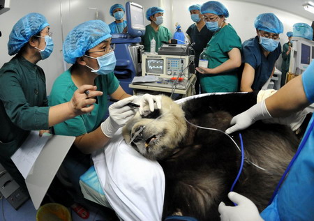 Veterinarians conduct an operation of cataract extraction on the left eye of a senior giant panda in the Xi'an, northwest China's Shaanxi province, December 20, 2008. The operation helped restore the 20-year-old bear's eyesight and it was recovering fast. [Xinhua]