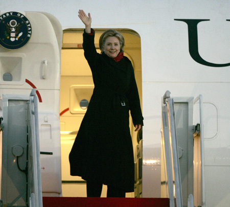 US Secretary of State Hillary Clinton waves as she departs for Beijing from the military airport in Seongnam, near Seoul, February 20, 2009. [Agencies]