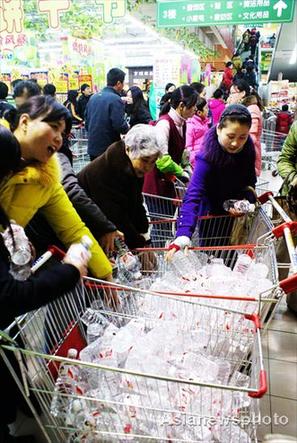 Customers rush to stock up on bottled water in a supermarket in Yancheng, Jiangsu province, Friday, Feb 20, 2009. The price of bottled water has shot up because of the increasing demand. [Asianewsphoto]