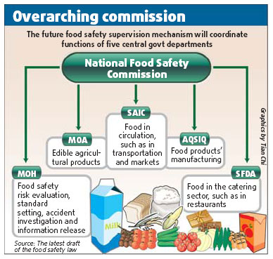 The commission will be a "high-level coordination and guidance" body, and details of its responsibilities and authority will be decided by the State Council, Liu Xirong, deputy director of the National People's Congress (NPC) Law Committee, said while explaining the change to legislators. The head of the proposed commission could be of vice-premier level, said Chen Junshi, a senior researcher with the National Institute for Nutrition and Food Safety affiliated to the Ministry of Health (MOH), indicating it will be a powerful body. The draft law is likely to be passed over the weekend after the NPC Law Committee Wednesday suggested putting it for vote on Saturday when the current NPC Standing Committee session ends. Liu said the proposed commission reflects the demands of legislators to streamline the current food supervision mechanism. More than 10 government departments are involved with food safety at present, leading to overlapping of responsibilities and lax law enforcement. The amendment to the draft law reduces to five the number of government departments: health (MOH), agriculture (MOA), quality control (AQSIQ), industry and commerce (SAIC), as well as food and drug safety (SFDA). The MOH has been given primary responsibility and a range of new tasks including evaluation of risks, setting standards, investigating accidents and releasing information. Another major change is that the latest draft law brings under its purview the supervision of health food. "Health food has become a quite big industry, but many problems remain," Liu said. "The supervision of such food should be even stricter." The draft stipulates that health food must not cause any harm to people, their labels and instruction leaflets must be true, and cannot claim the products can prevent or cure illness. The State Council is required to release a detailed regulation on health food, according to the draft. By the end of 2007, there were 1,640 health-food producers in the country with an annual output of about 100 billion yuan ($14.6 billion), according to figures from the NPC Standing Committee's Legislative Affairs Committee. Legislators said they were glad that their opinions were taken into consideration. "I suggested improving the current food safety supervision mechanism during the draft law's last review in October 2008, and I'm happy the latest draft has made changes accordingly," Yu Zhenggui, an NPC Standing Committee member, said. Experts said the law, if passed, will be a milestone in food safety regulation. "The biggest progress is that the law highlights the importance of safety risk assessment," Chen said. The draft law devotes a whole chapter to risk assessment, and requires the MOH to set up a risk assessment committee comprising experts in health, agriculture, food and nutrition. Zhang Yongjian, executive director of the research center for development and regulation of food and drug industry affiliated to the Chinese Academy of Social Sciences, said legislation by itself cannot solve all problems. "There are about 200 million farmers and 500,000 food producers in the country. Such a scattered production model is the fundamental reason behind so many food safety incidents," he said. |