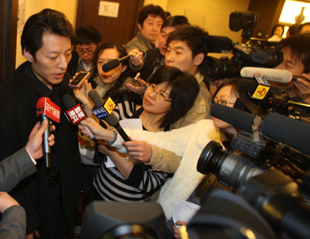Updated: 2009-03-02 13:21 Niu Xianfeng, Deputy-director of the National Treasures Fund that seeks to retrieve looted treasures, speaks to media at a news conference in Beijing, March 2, 2009. NTF advisor Cai Mingchao successfully bade for the two bronze sculptures in Paris last week, but said he would not pay for the treasures looted from Beijing. [CFP] |