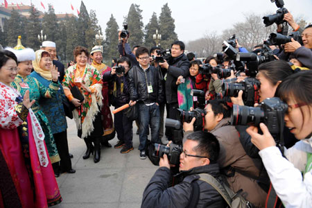 Photographers take pictures for political advisors outside the Great Hall of the People before the Second Session of the 11th Chinese People's Political Consultative Conference (CPPCC) in Beijing, March 3, 2009.[Xinhua]