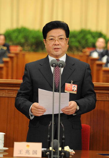 Wang Zhaoguo, secretary-general of the 2009 parliamentary session, addresses the opening of the second plenary meeting of the 11th NPC annual session in Beijing, capital of China, March 9, 2009. [Xinhua]