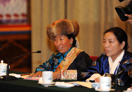 A Tibetan deputy speaks during a panel discussion at the ongoing National People's Congress (NPC) in Beijing, March 9, 2009. [Xinhua]