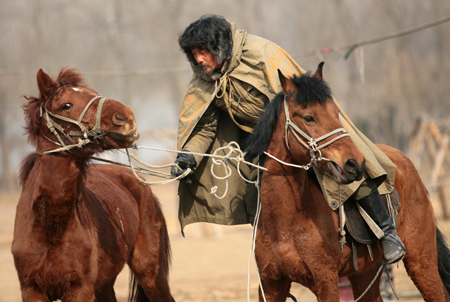 Li Jing holds the reins of his two horses after arriving in Changping, Beijing's north suburb, March 10, 2009. [CFP]