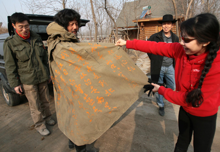 Li Jing displays the poem written on his coat: "The Red Army Fears No Hardship during the Expedition" by Chairman Mao to local horse riding enthusiasts in Changping, Beijing's north suburb, March 10, 2009. [CFP] |
