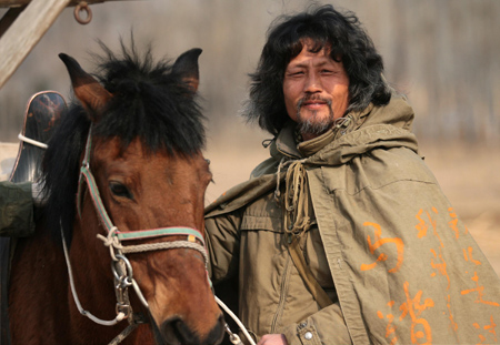 Li Jing poses with one of his two horses after arriving in Changping,Beijing's north suburb, March 10, 2009. [CFP]