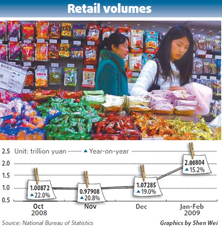 Nearly 30 percent of those surveyed said it was better to increase spending rather than save, up 3.5 percentage points from the previous quarter, but still 7.3 percentage points lower than the first quarter of 2008. This indicates that China faces a challenge in stimulating domestic demand even as exports have continued to weaken, analysts said. In February, exports fell 25.7 percent year-on-year, according to Customs figures. Around 13.8 percent of the respondents said they thought it was a good time to buy stocks, 5.1 percentage points higher than the previous quarter, marking the second consecutive quarter when the proportion has risen. A large part of China's 4-trillion-yuan stimulus package, released last November, will be earmarked for livelihood-related areas such as health, as the country tries to encourage people to spend more than save. However, as people's incomes are expected to drop amid the economic slowdown, they are still not in a mood to spend. The country's retail sales too slowed slightly in the first two months of the year, rising by 15.2 percent year-on-year, the National Bureau of Statistics said yesterday. It was 5 percentage points lower than the same period last year. Retail sales increased by 21.6 percent for the whole of 2008. "The country's retail sales may drop in the coming months as the economy weakens and people expect less incomes," said Dong Xian'an, economist, Southwest Securities. "The drop in exports is leaving a large productive surplus, and if this is not absorbed with domestic demand, unemployment will rise, with possibly devastating consequences," warned Alaistair Chan, economist, Moody's Economy.com. |