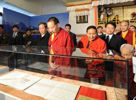 The 11th Panchen Lama Erdeni Gyaincain Norbu (front) visits an exhibition entitled "Democratic Reform in the Tibet autonomous region" in Beijing, March 15, 2009. [Xinhua]