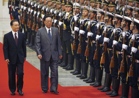 He pledged China would make joint efforts with the DPRK to expand mutually beneficial cooperation to better serve the peoples under the principle of "inheriting tradition, aiming at the future, good-neighborly and friendly relations, and enhancing cooperation." Kim said the DPRK valued its traditional friendship with China and would use the "China-DPRK Friendship Year" to expand cooperation in all areas. Kim is on an official goodwill visit to China and to attend a ceremony marking the 60th anniversary of the China-DPRK diplomatic relationship and the launch of the China-DPRK Friendship Year in Beijing. Wen asked Kim to convey his greetings to DPRK leaders. Wen said China and the DPRK were good neighbors and shared a profound friendship. "With our joint efforts, China-DPRK relations have developed soundly," Wen said. "This works for the development of both countries and contributes to regional peace and stability," Wen said. Wen said the DPRK was among the first countries to establish diplomatic relations with China. "Your visit coincides with the 60th anniversary of bilateral diplomatic relations and the China-DPRK Friendship Year in Beijing," Wen said. "The visit will help push the development of bilateral relations and enhance friendship between the two peoples." Wen said he would like to exchange views with Kim on bilateral relations and issues of mutual interest. Saying this was his first visit to China since taking office in April 2007, Kim first extended the regards of the DPRK leaders to Wen. Kim congratulated China on successfully convening the top legislature's latest annual session. He also hailed China's efforts to cope with the impact of the global financial crisis and its fight against severe drought. Kim reiterated that the DPRK would unswervingly support the Chinese government's stance on the Taiwan issue, Tibet-related issues and human rights. Later Wednesday, Wen and Kim will attend the opening gala for the China-DPRK Friendship Year in Beijing. During his five-day visit to China, Kim will also hold talks with other Chinese state leaders.