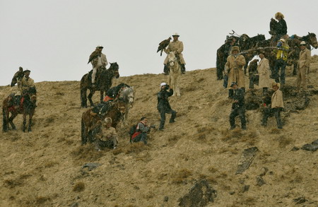 Kirgiz herders display their falcons to photographers during the Second Falcon Cultural Festival in Akqi county, northwest China's Xinjiang Uygur autonomous region on March 21, 2009. [Xinhua]