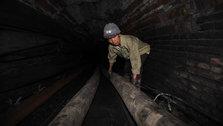 A rescuer prepares pipes to draw water from a flooded coal mine in Sanjiaotang township of Changning, a city in central China's Hunan province, March 21, 2009. [Xinhua]