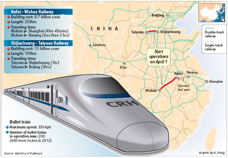 Updated: 2009-03-25 14:24 Two high-speed railways opening on April 1 will dramatically slash travel time between the hinterland and the coastal regions, a senior railway official said yesterday. Stretching more than 350 km, the Hefei-Wuhan passenger railway, along with the Hefei-Nanjing lines opened last year, will provide the shortest link between Central China and East China's Yangtze River Delta region.