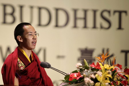 The Panchen Lama, Gyaltsen Norbu, delivers a speech during the opening ceremony of the second World Buddhist Forum at the Buddhist Palace in Wuxi, east China's Jiangsu province, March 28, 2009. [Agencies]