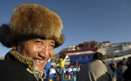A Tibetan man attends a ceremony to mark the first Serfs Emancipation Day in front of Potala Palace in Lhasa, capital of southwest China's Tibet autonomous region, on March 28, 2009. [Xinhua]