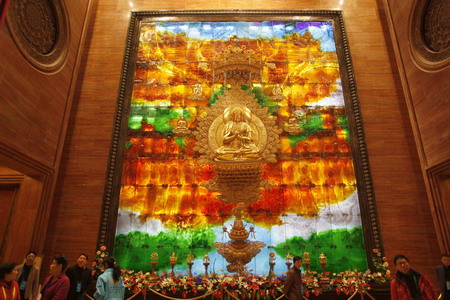 Guests walk around a giant Buddhist decoration wall inside the Buddhist Palace before the opening ceremony of the second World Buddhist Forum in Wuxi, east China's Jiangsu province, March 28, 2009. [Agencies]
