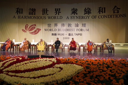 Buddhists figures and the Panchen Lama, Gyaltsen Norbu (3rd R), attend the opening ceremony of the second World Buddhist Forum at the Buddhist Palace in Wuxi, east China's Jiangsu province, March 28, 2009. [Agencies]