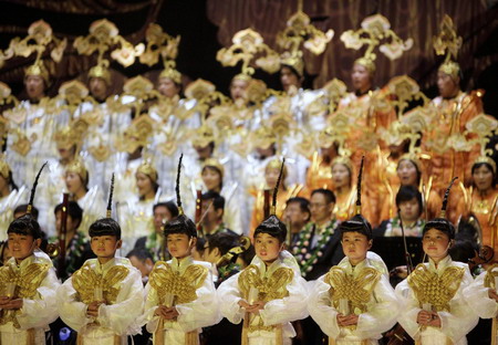 Children perform during the opening ceremony of the second World Buddhist Forum at the Buddhist Palace in Wuxi, east China's Jiangsu province, March 28, 2009. [Agencies]