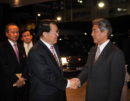 Li Changchun (L, front), a member of the Standing Committee of the Political Bureau of the Communist Party of China (CPC) Central Committee, meets with Japanese Foreign Minister Hirofumi Nakasone in Tokyo, on March 29, 2009. Li Changchun arrived in Tokyo to kick off his official goodwill visit Sunday. [Xinhua]