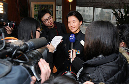 Famous Chinese folk singer Song Zuying talks to reporters during a break of a panel discussion of the Second Session of the Chinese People's Political Consultative Conference (CPPCC) in Beijing February 5, 2009. [news.cn]