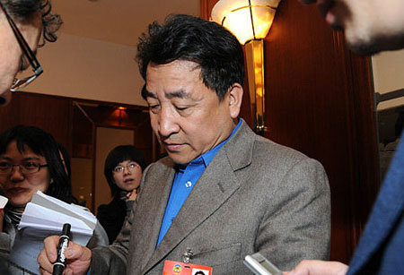 Jiang Kun, a famous cross-talker, signs his autograph for a reporter during a break of a panel discussion of the Second Session of the Chinese People's Political Consultative Conference (CPPCC) in Beijing March 5, 2009. [news.cn]