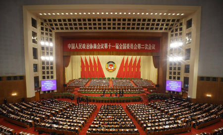 Updated: 2009-03-12 11:58 The closing meeting of the Second Session of 11th National Committee of the Chinese People's Political Consultative Conference (CPPCC) is held at the Great Hall of the People in Beijing, March 12, 2009. [Xinhua]
