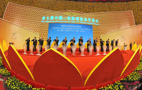 Leaders and officials from 10 ASEAN (Association of Southeast Asian Nations) countries attend the opening ceremony of the 7th China-ASEAN Expo in Nanning, the capital of South China’s Guangxi Zhuang autonomous region on Oct 19, 2010. The six-day Expo themed “free trade area and new opportunities” is the first one since the establishment of the China-ASEAN Free Trade Area on Jan 1, 2010.
