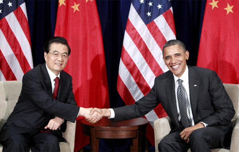 Chinese President Hu Jintao and his US counterpart Barack Obama met here Saturday to discuss bilateral ties and agreed to work together to continuously strengthen the China-US cooperative partnership.