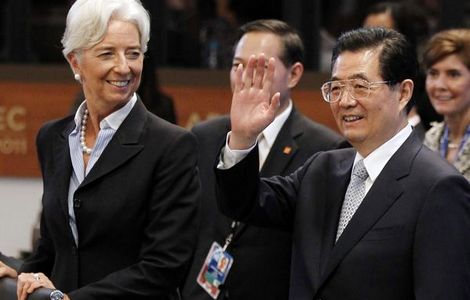 China's President Hu Jintao (R) waves as International Monetary Fund (IMF) Managing Director Christine Lagarde looks on during the first plenary meeting at the APEC Summit in Honolulu, Hawaii, November 13, 2011.