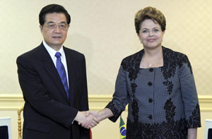 Visiting Chinese President Hu Jintao and his Brazilian counterpart Dilma Rousseff met here Wednesday to discuss the expansion of bilateral cooperation.