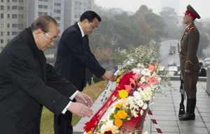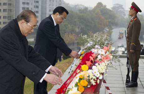 Visiting Chinese Vice-Premier Li Keqiang laid a wreath at the Friendship Tower in Pyongyang, paying tribute to Chinese soldiers killed in the Korean War.