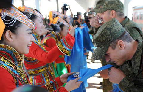 Bangbu, East China's Anhui province A paramilitary policeman and students sign their names on a banner calling for protection of the earth at a primary school in Bangbu, East China's Anhui province, on April 20, 2012. The armed police visited the school to attend activities for World Earth Day, which is April 22. [Photo/mod.gov.cn] |