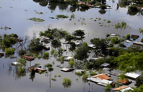 Beijing Party chief Guo Jinlong(3R) and acting mayor Wang Anshun(2L) mourned victims killed in the July 21 downpour, when inspecting the disaster relief work in Fangshan District, July 27, 2012. [Photo/Beijing Daily] |