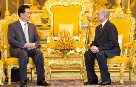 President Hu Jintao met Cambodian King Norodom Sihamoni Saturday to discuss the development of all-round cooperation between China and the Southeast Asian nation.