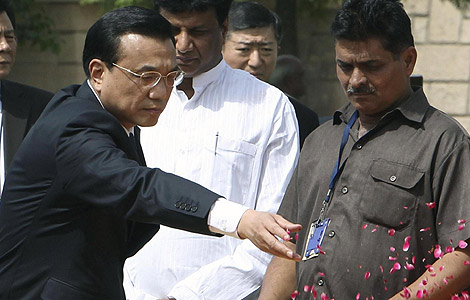 Chinese Premier Li Keqiang scatters rose petals at the Mahatma Gandhi memorial at Rajghat in New Delhi May 20, 2013. [Photo/Agencies]