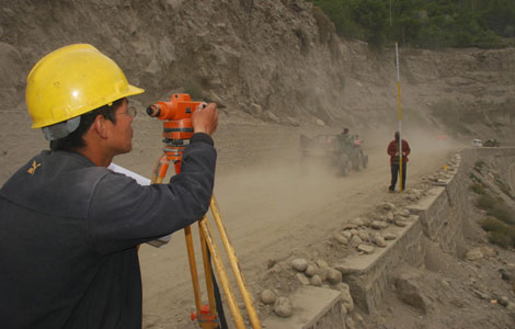 Workers survey the road on the Karakoram Highway construction site in northern Pakistan.