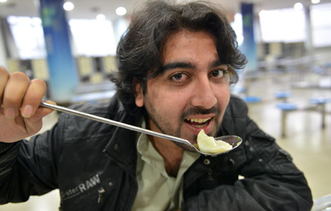 A student from Pakistan eats a dumpling at North Sichuan Medical University in Sichuan province on Feb 5, 2013.